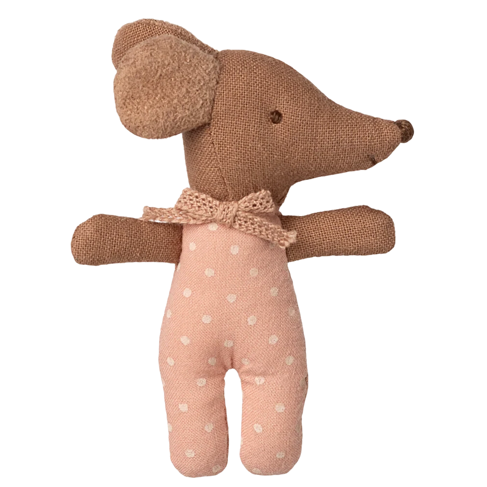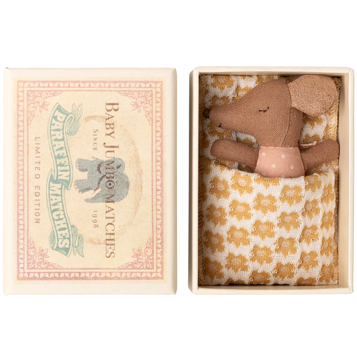 A classic Maileg item. This mouse is ready for hours of play and sleeps tight in the little matchbox. The clothes and bedlinen are made of soft fabrics with unique prints in beautiful colors.