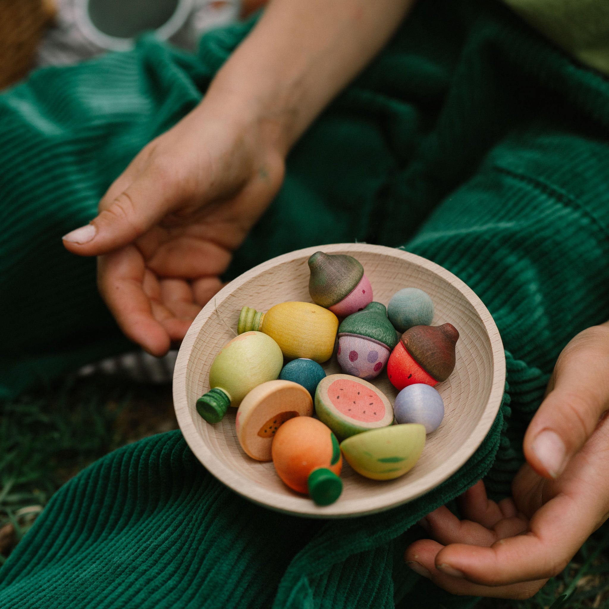 Have you ever tasted the colors of a rainbow? These hand-painted wooden fruits invite children to explore a colorful world full of bright shapes and bold colors. From plump berries to citrus fruits, each piece inspires picking, sharing, and mixing encouraging symbolic play and open-ended play.