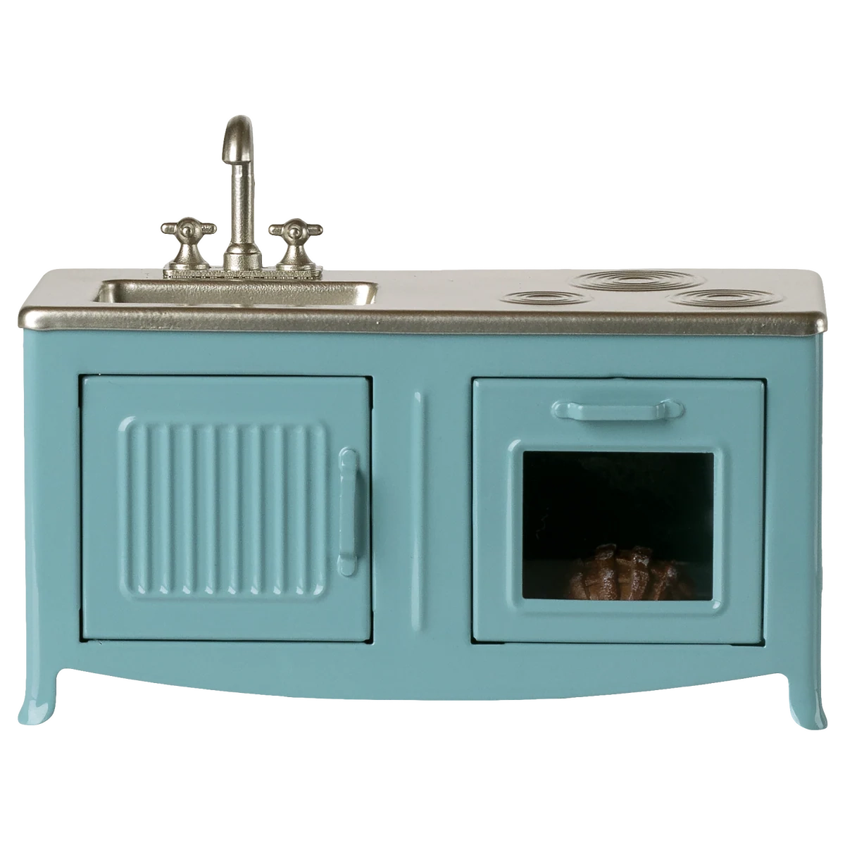 The heart of every home is the kitchen. This metal kitchen has a beautiful color tone and has many playful details such as cabinet door, sink and an oven with a freshly baked pie. It is perfect in size for the mouse family.
