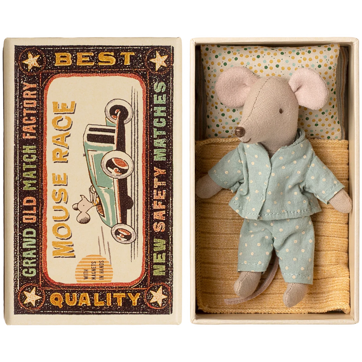 Αυτό το ποντίκι είναι έτοιμο για πολλές ώρες παιχνιδιού και κοιμάται γλυκά σε ένα μικρό κουτί. Τα ρούχα και τα σκεπάσματα είναι κατασκευασμένα από απαλά υφάσματα με μοναδικές εκτυπώσεις και όμορφα χρώματα.