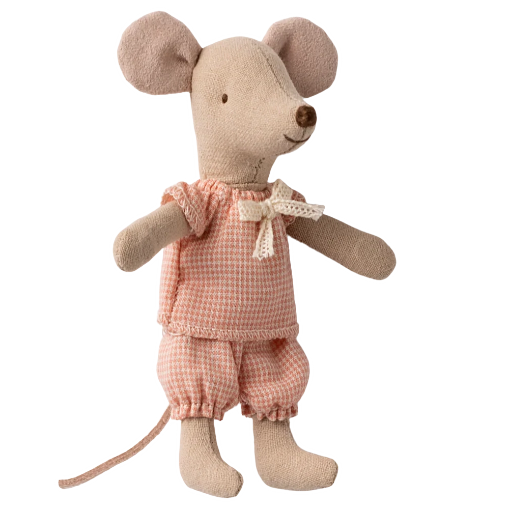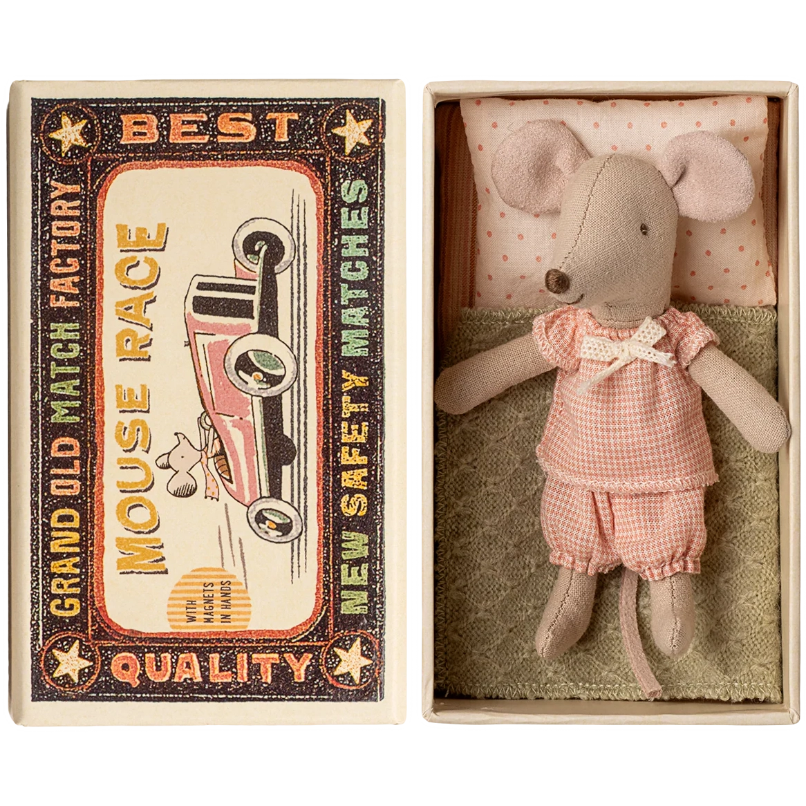 Ένα κλασικό αντικείμενο Maileg. Αυτό το ποντίκι είναι έτοιμο για ώρες παιχνιδιού και κοιμάται σε ένα μικρό σπιρτόκουτο. Τα ρούχα και τα σκεπάσματα έχουν μοναδικά τυπώματα και όμορφα χρώματα.