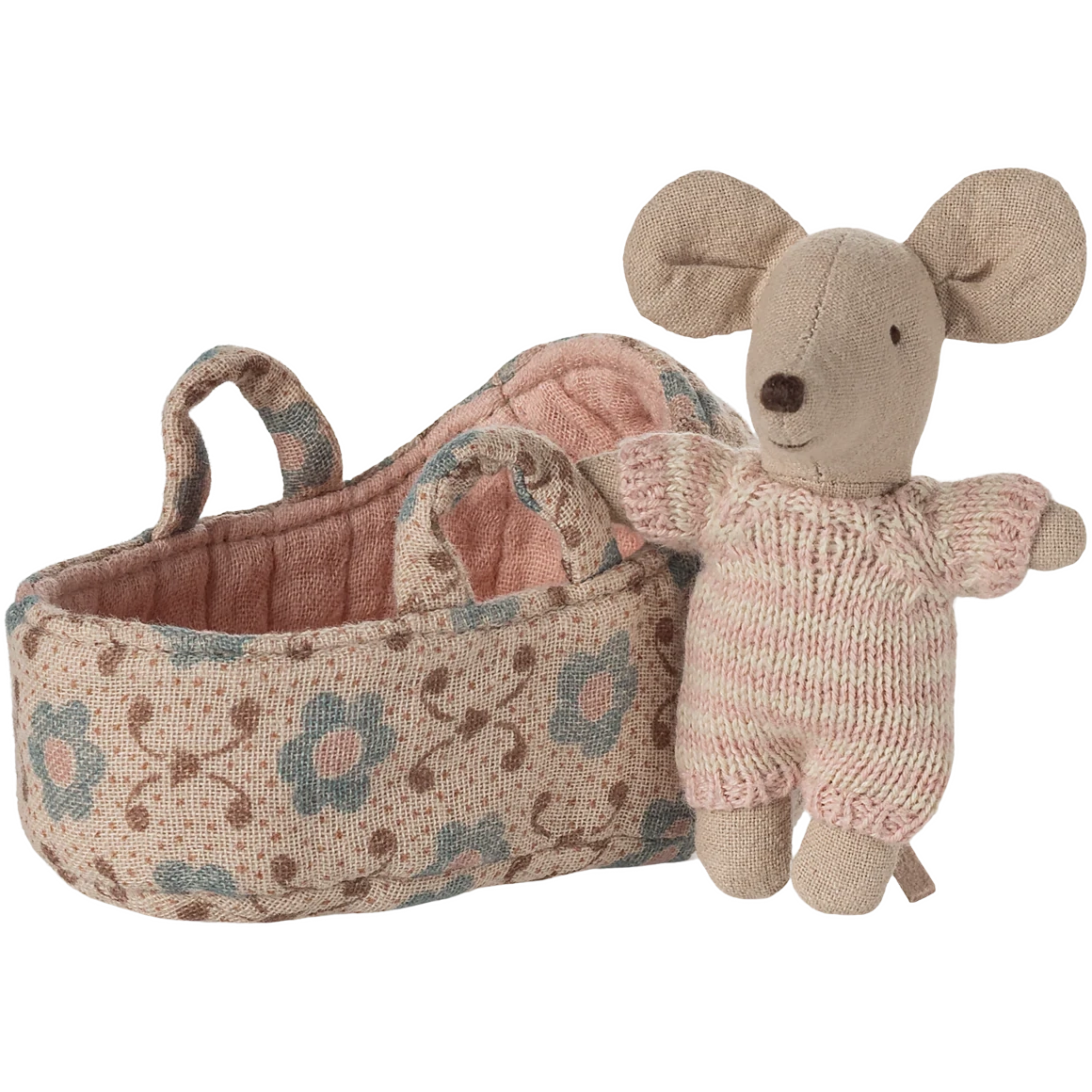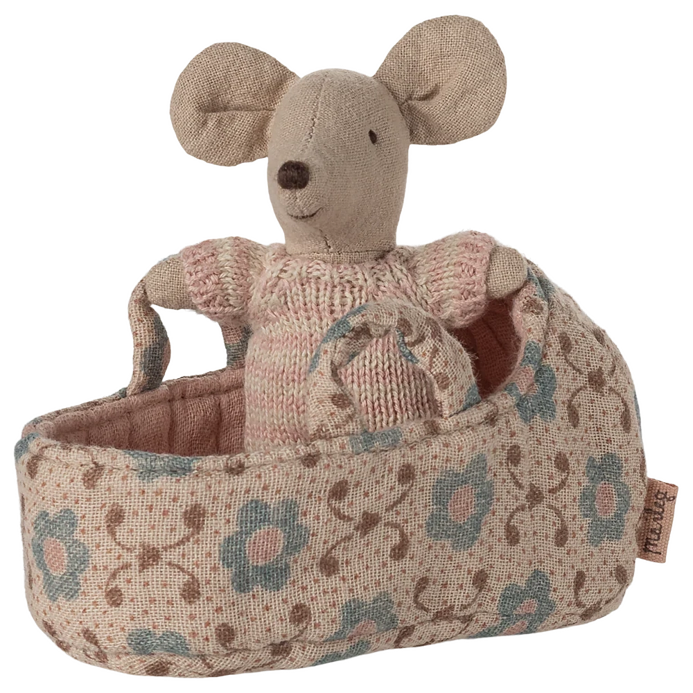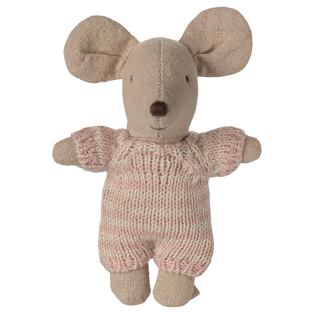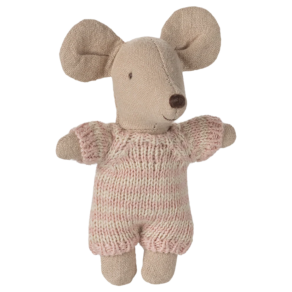 A small baby mouse in a soft and striped knitted suit. It sleeps for hours in its little quilted carry cot.